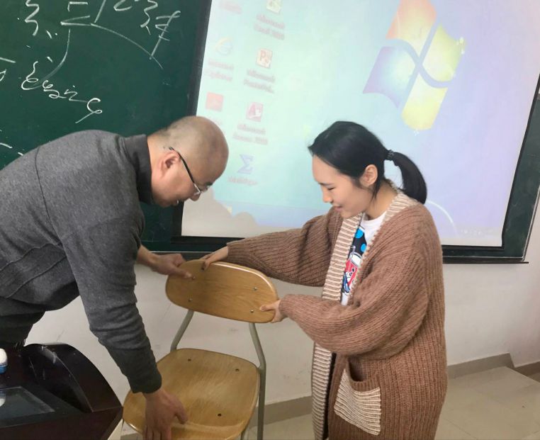 学生为任课老师搬椅子,协助老师做好课前准备和各项服务