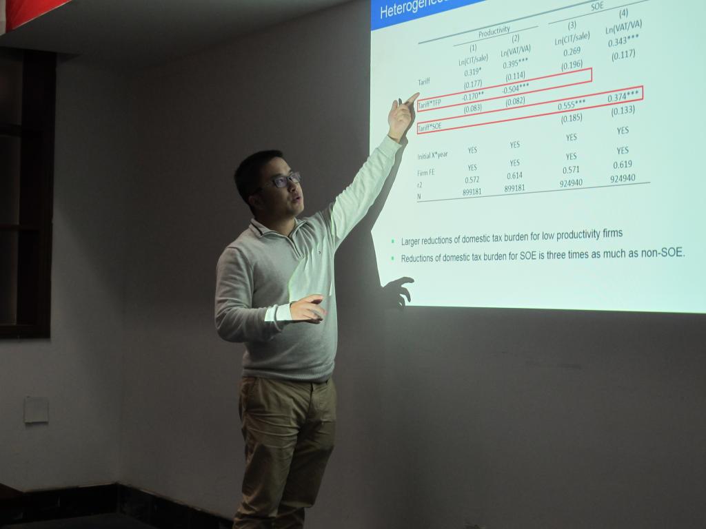 戴觅副教授博士毕业于北京大学国家发展研究院,研究成果发表于Journal of International Economics、Journal of Development Economics、《管理世界》、《经济学(季刊)》等国内外顶尖期刊,曾荣获第18届“安子介国际贸易研究优秀论文奖”。报告会上,戴觅副教授首先为大家详细梳理了相关文献,提出贸易自由化进程会使得一国之内同时出现受损者和受益者,那么政府作为再分配和经济风险的主要调节者,是否会有所行动?从这一问题出发,戴觅副教授以中国降低关税为例研究了贸易自由化冲击下发展中国家的政府行为。基于1998-2007年中国工业企业数据库和城镇家庭调查数据的实证分析发现,政府存在对企业层面的再分配效应,即政府会刻意调整征管力度以缓冲企业受到的关税下降冲击,而家庭层面的再分配效应没有得到实证支持。同时,关税下降越多的城市,政府收支规模也受到显著影响。