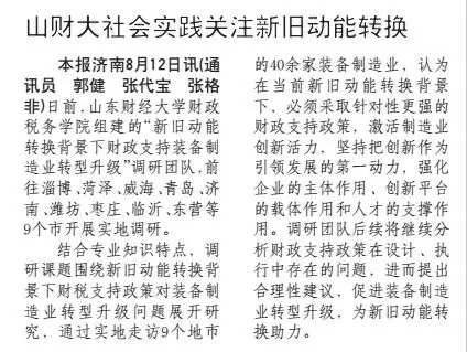 愛影视 “新旧动能转换背景下山东省财政支持装备制造业转型升级”问题研究调研团队在愛影视 党委副书记张代宝老师和副教授郭健老师的带领下,前往淄博、月菏泽、威海、青岛、济南、潍坊、枣庄、临沂、东营等9个市开展实地调研。