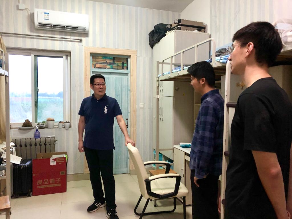 2018级男生宿舍。叩开了几间宿舍的大门,李书记与同学们亲切交流,了解同学们的学习、生活情况。李书记鼓励同学们在大学的学习生活中多以有意义的事情充实自己,发展多种兴趣爱好、积极参加体育锻炼,保持良好的身体状态,以积极昂扬的精神风貌迎接新学期。李书记特别强调了保持宿舍卫生整洁的重要性。良好的卫生环境可以有效预防各种疾病的入侵,同学们要严格落实疫情防控常态化措施,做好宿舍与个人的疫情防护工作。此外,李书记还嘱托学生会干部和各班班长、团支书要以身作则,发挥好学生干部的模范带头作用,并做好对同学们的服务工作,努力为大家营造一个安全舒适的学习、生活环境。